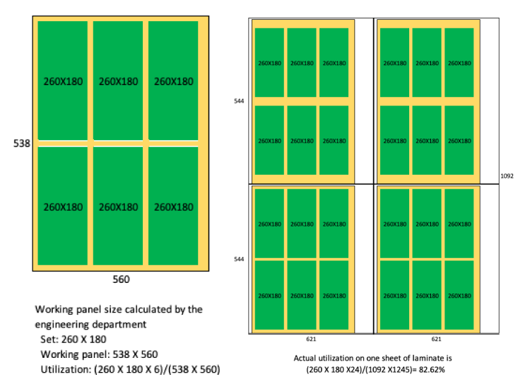 The size of this PCB is 280mmX180mm. Engineers calculate the dimension of the working panel by adding the process edge (or working space) required for routing and for surface finish. The working panel's size is 560mm * 538mm. In this case, the utilization rate of the working panel is 93.2% (260X180X6)/(560X538)=93.2%.When the working panel is calculated on the laminate sheet with a dimension of 1,092mm X1,245mm the utilization rate drops to 82.62% which is calculated as (260X180X6X4)/(1092X1245)=82.62%.
