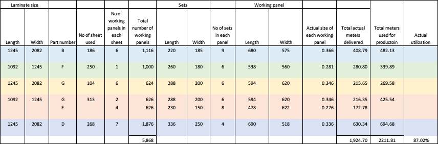 The following table shows the results of using optimization software to calculate how the five part numbers with lower than 89% utilization to be allocated in the laminate sheet with different dimensions. The result is a very satisfactory 87.02% utilization.