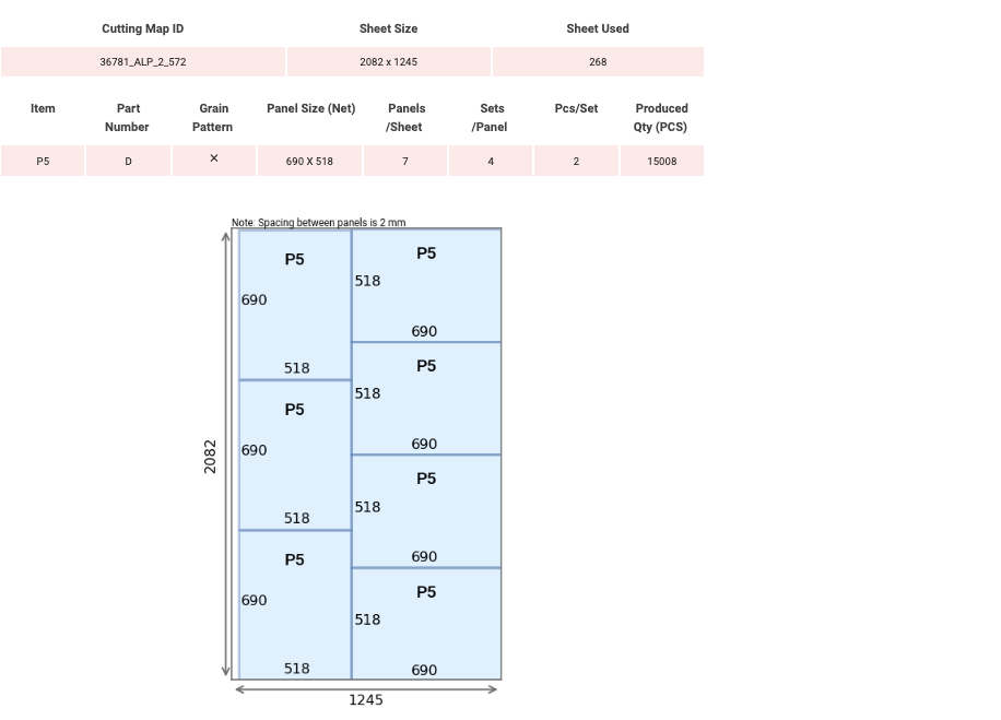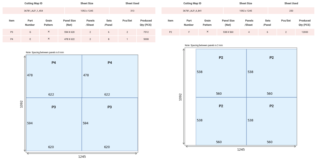 The laminate sheet with dimension of 1,245X2,082mm and 1,092X1,245mm are selected and the quantities are allocated as above. The allocation is done on the basis of respective part number working panel sizes determined by the engineering department on the basis of the process edge (or working space) required.