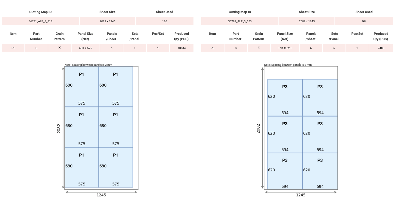 The followings are the cutting map from the optimization software for the 5 part numbers.
