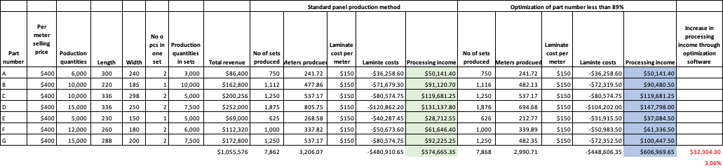 Assuming each sq. meter of PCB is sold for $400 per sq. meter and the cost of laminate is $150, the total income for the 7 part numbers is $1,055,576. The laminate costs of producing using standard sized working panels is $480,910.65 giving a processing income of $574,665.35. On the other hand, optimizing the allocation of the 5 part numbers with lower than 89% utilization rate on laminate sheet will reduce the laminate costs to $448,606.3, giving a processing income of 606,969.65.It is an increase of income by $32,304.3.