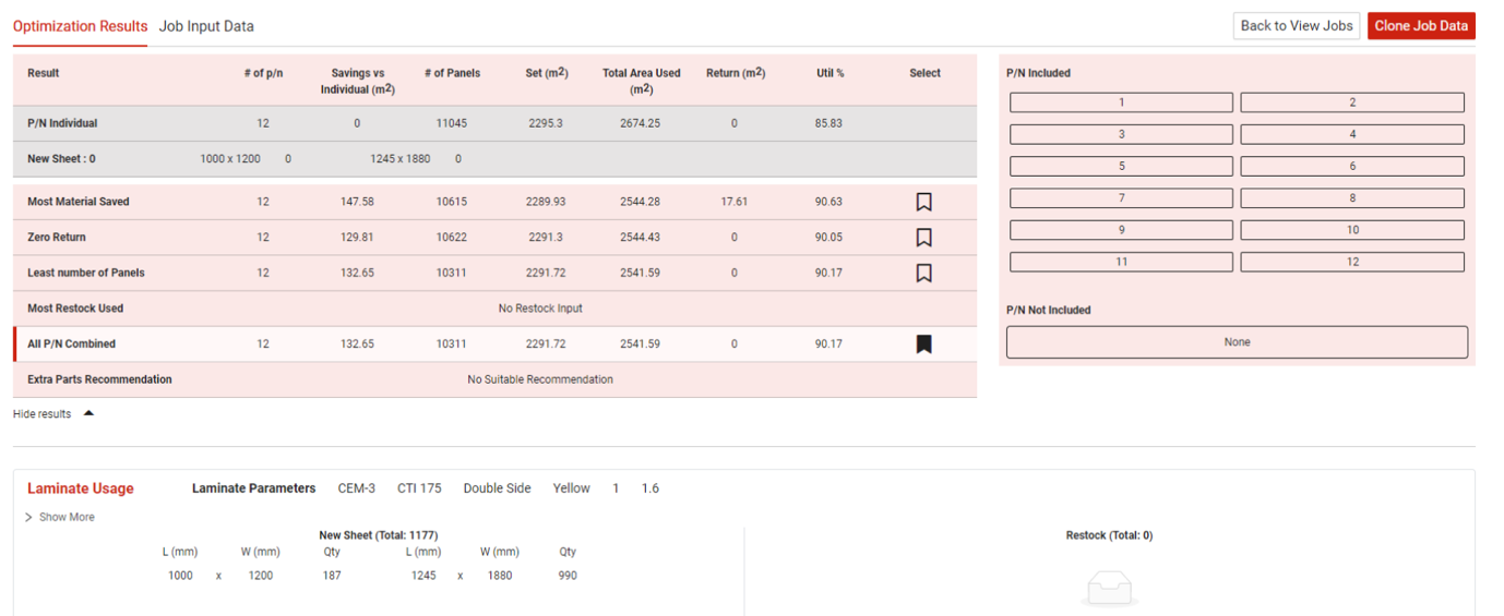 In this example, There are 12 part numbers being run on the optimization software. The first line shows the result of these 12 part numbers with each laminate sheet only having one part number. The utilization rate is 85.83% which is respectable.