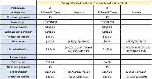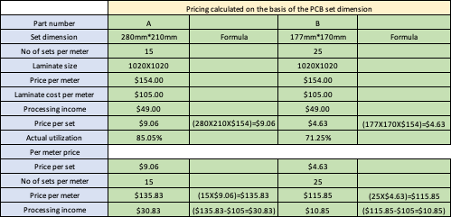 The selling price is $154 per sq meter, and the laminate costs is $105 per square meter. The processing income is $ 49. The price of the part number A is $10.27 and that of the part number B is $6.16.From the perspective of the PCB factory, the customer is paying for the entire sheet of laminate. The utilization rate does not affect the PCB factory as it is still receiving $49 processing come per meter regardless of the utilization rate.
