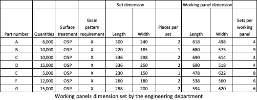 2) The engineering department should only set adequate process edge (or working space) based on the production process and machine requirements. Because the engineers normally works on one part number at a time when calculating the working panel sizes, it is common for the engineering department to add bigger process edge than necessary in order to consume the entire laminate sheet.