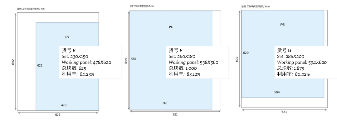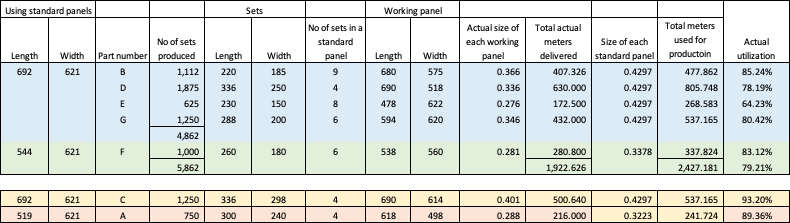 When putting the seven part numbers into the different sized standard working panels, we can see the different utilization for each part number as follows: